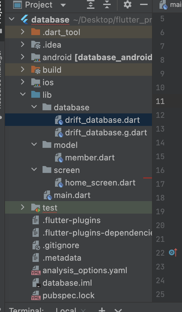 데이터베이스 설정을 위해 drift_database.dart 파일을 만들어 줍시다.