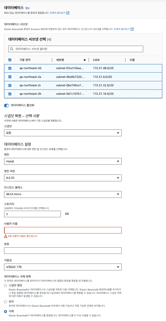 - Elastic Beanstalk를 통해 생성된 AWS 리소스는 Elastic Beanstalk의 관리 대상이므로, 환경을 삭제할 때 해당 리소스도 함께 삭제됩니다.