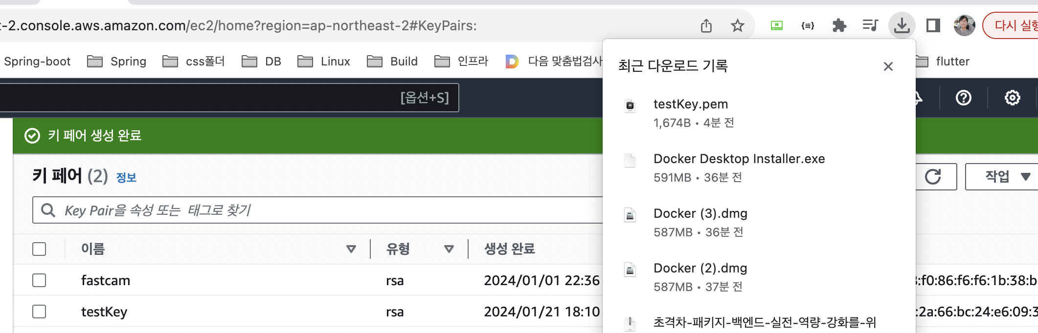 - 키 페어 생성 확인 및 .pem 파일 다운로드