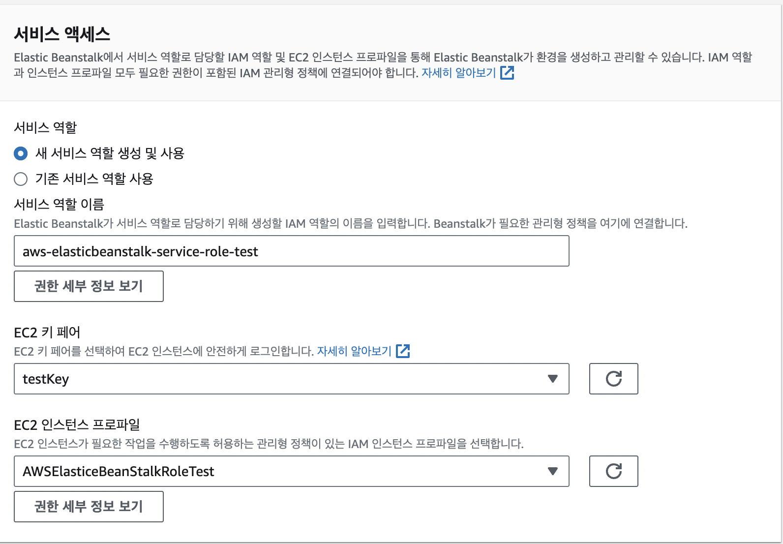 - 미리 생성한 역할과 키페어 선택( 서비스 역할 이름은 원하는 이름으로 ) 후 다음