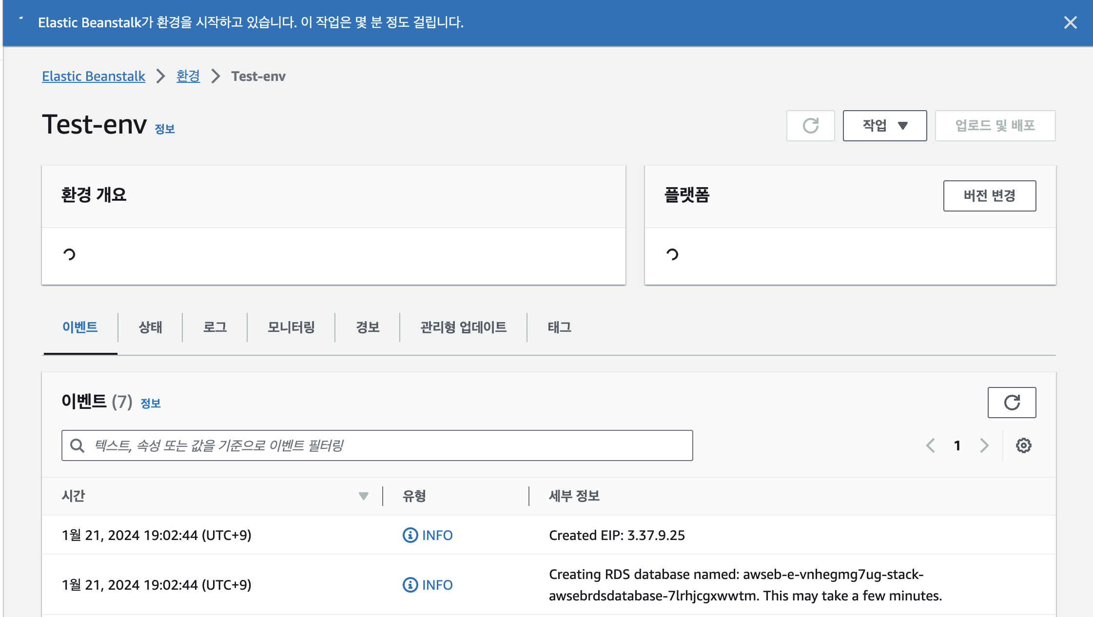 - 제출 후 아래 화면처럼 ElasticBeanstalk이 생성되고 있습니다.