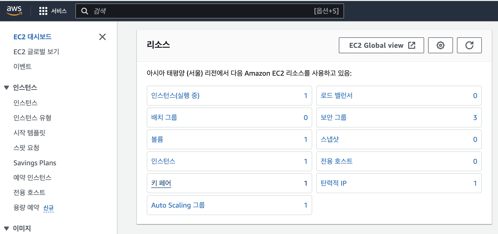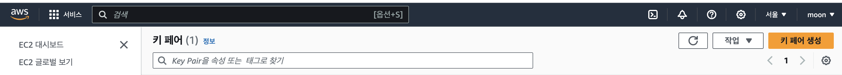 - 콘솔에서 EC2 검색 후 아래화면에서 키 페어 클릭