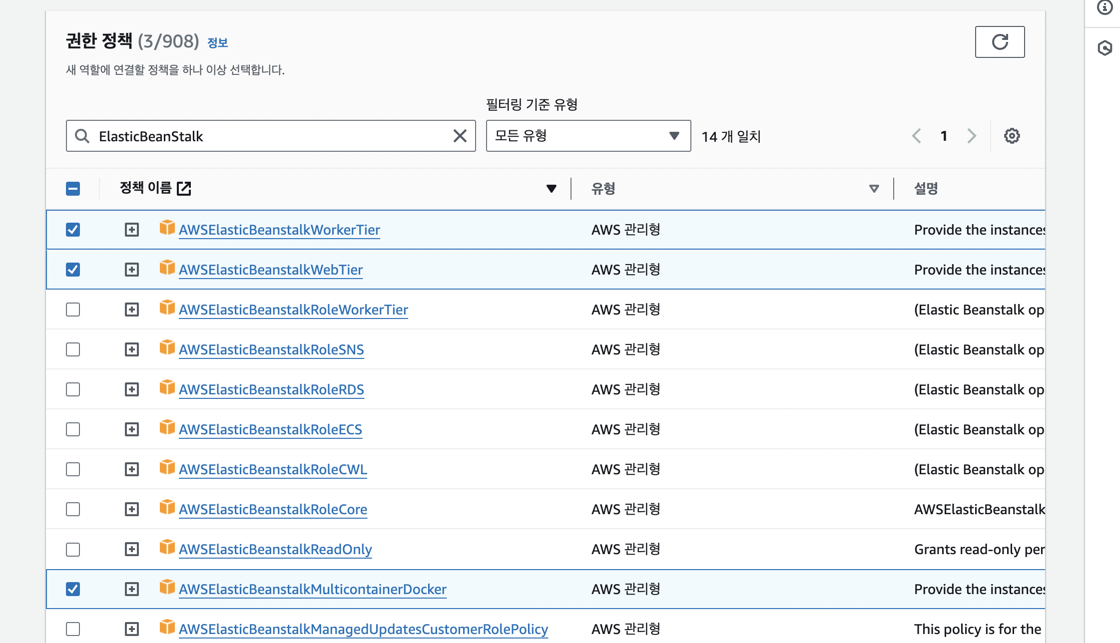 - ElasticBeanStalk 검색 후 아래 3가지 정책 선택 후 다음