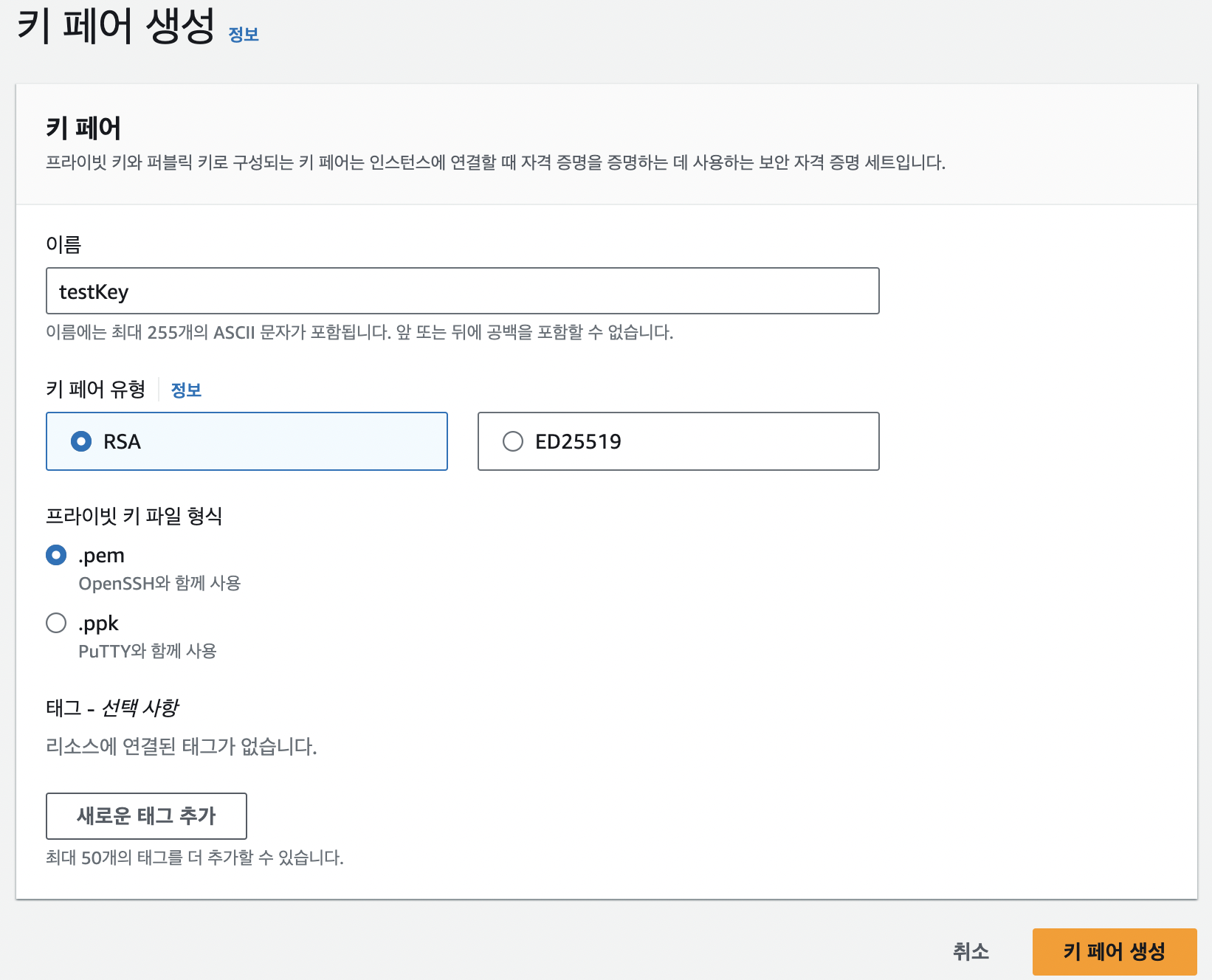 - 키 페어 이름을 입력한 다음 키 페어 생성 클릭