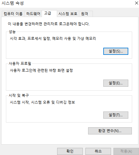 고급 탭을 클릭하면 위처럼 환경 변수 버튼이 나온다. 클릭