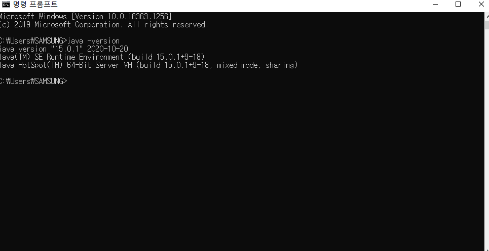 해당 cmd 화면에서 java -version을 입력 후 엔터키를 누르면 설치한 자바의 버전을 확인할 수 있다.