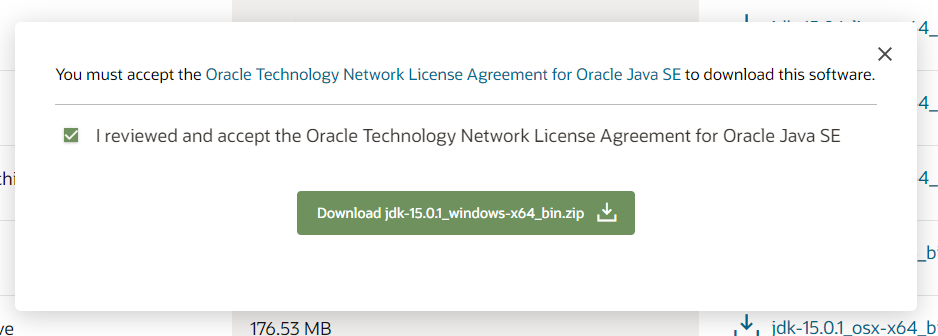 자신의 환경에 맞는 파일을 선택하였으면 위와 같이 라이센스 사용에 동의하겠냐는 팝업창이 뜨는데 동의한다의 체크하여 주고 다운로드를 클릭한다.(버튼 클릭 후 로그인 창이 뜰 경우 오라클 사이트의 계정 생성 후 로그인하여 주어야 한다.)