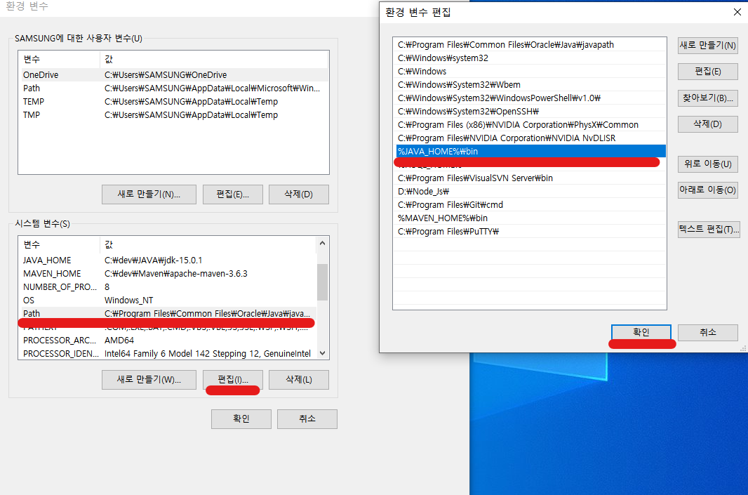Path 선택 후 편집 버튼을 누른 다음 오른쪽과 같은 팝업창이 뜨면 새로 만들기 -> %JAVA_HOME%\bin 을 만들어 준후 확인 버튼 클릭