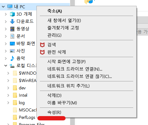 내 PC(또는 내 컴퓨터)를 마우스 우 클릭하면 위와 같이 속성이 나온다.