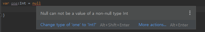 코틀린은 기본적으로 런타임이 아닌 컴파일 시점에서 null값을 허용하지 않도록 되어 있습니다. null값이 들어갈 가능성이 있는 코드에는 에러 표시되어 컴파일이 되지 않습니다.