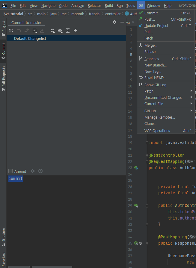 그 후 상단에 Git 메뉴사 생성되는데 여기서 Commit을 눌러 변경사항들을 github에 올려 관리하시면 됩니다.