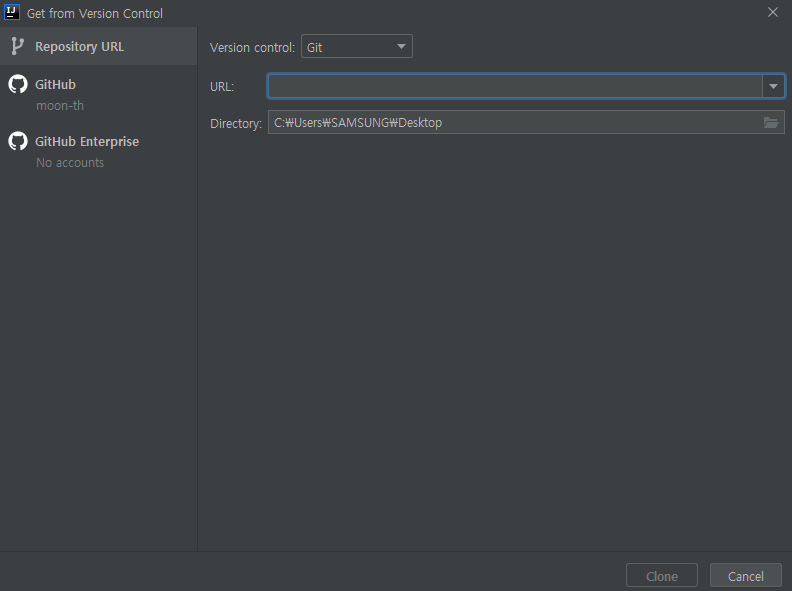 다음 Git Hub에 새 성한 레파지토리의 url을 복사하여 넣어 줍시다. 그다음 클론을 눌러줍시다.