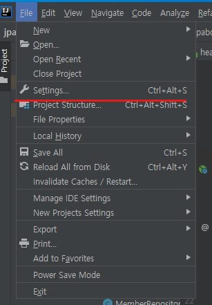 왼쪽 상단의 File -> Settings를 클릭하여 줍시다.