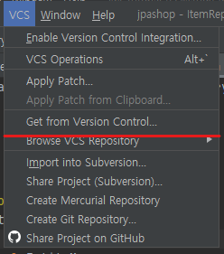 다음 상단 메뉴에서 VCS -> Git from Version Control을 클릭하여 줍니다.