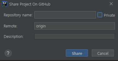 마지막으로 Share 버튼을 누르게 되면 깃허브 레파지토리에 커밋할 수 있습니다.
