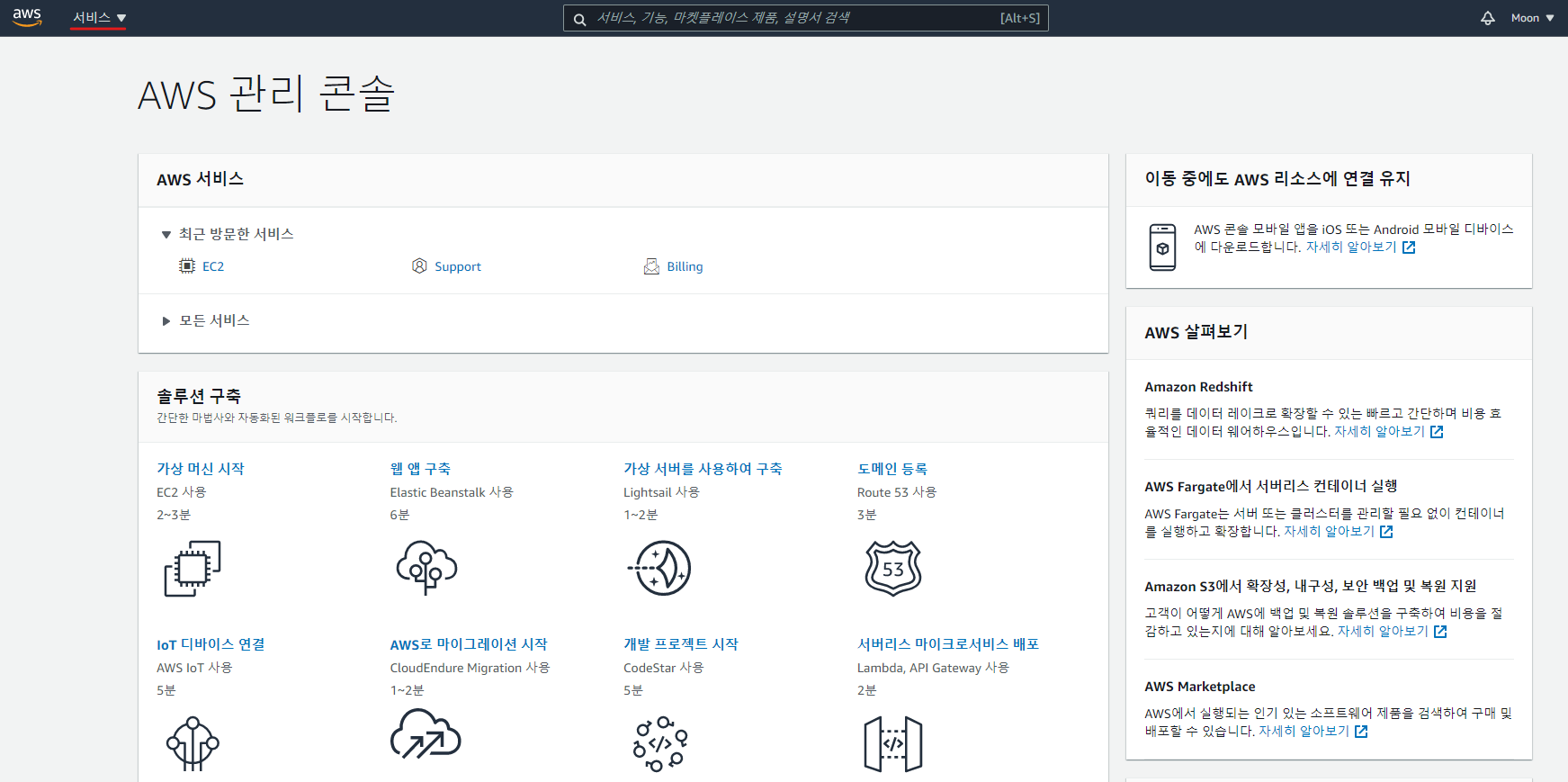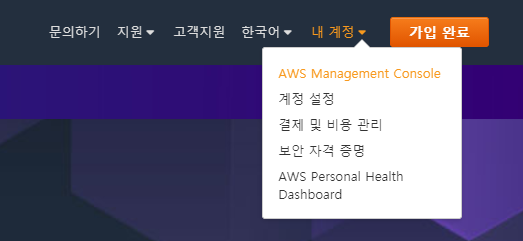 내 계정 -> Aws Management Console 선택하여 Console 화면으로 이동하여 줍시다.