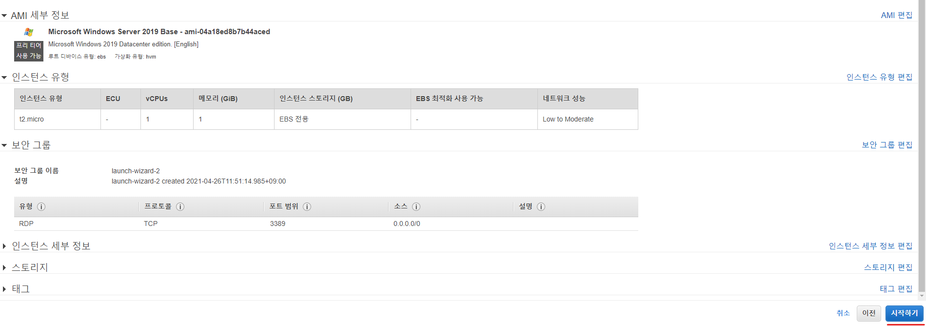 인스턴스 유형 등을 확인 후 하단의 시작하기 클릭