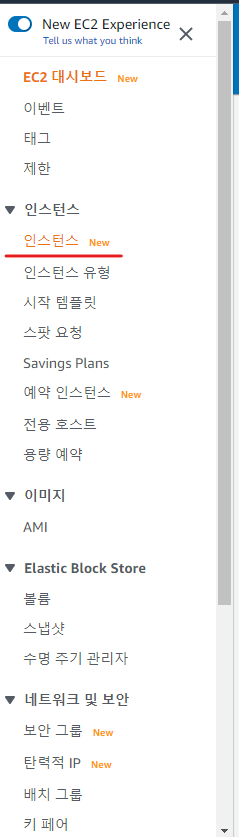 왼쪽 메뉴바에서 인스턴스를 클릭하여 줍시다 ( EC2 에서는 컴퓨터 한 대를 인스턴스라고 합니다. )