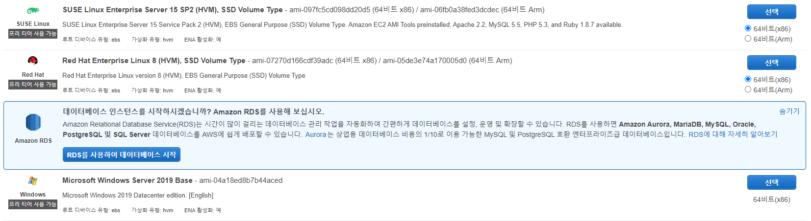 어떤 OS 환경에서 사용할지 선택하여 줍시다.( 무료로 사용하려면 프리 티어 사용 가능으로 되어있는 것을 선택)