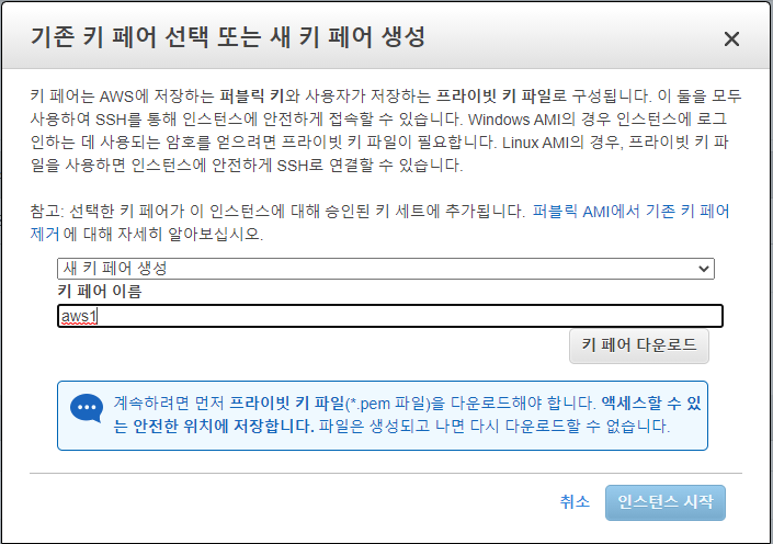 해당 화면에서 키 페어를 생성하여 줍시다. 키 페어 이름( 원하는 이름으로 생성 )을 입력 후 키 페어 다운로드 후