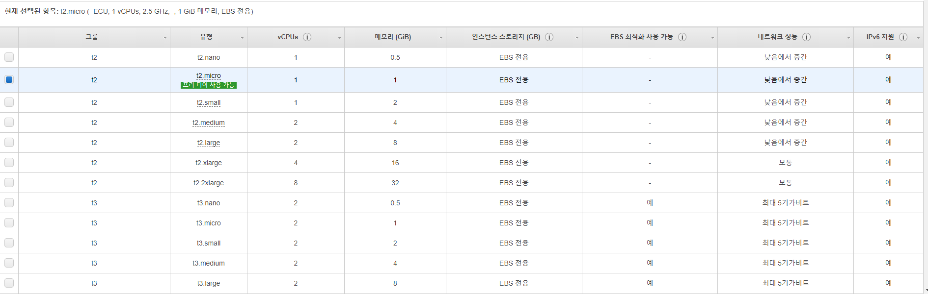 여러 버전 중 무료로 사용 가능한 t2.micro를 선택하겠습니다.