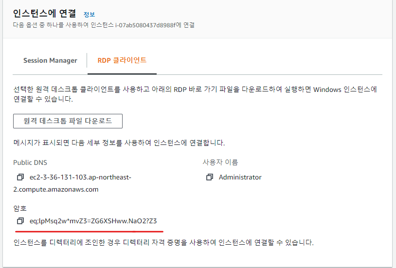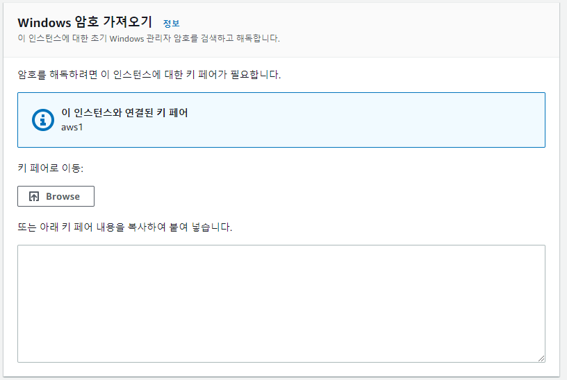 해당 화면이 나타나면 이전에 생성한 키 페어 파일을 업로드하여 줍시다. 업로드 후 하단의 암호해독 버튼을 클릭하게 되면 화면처럼 암호가 생성된 것을 확인할 수 있습니다.