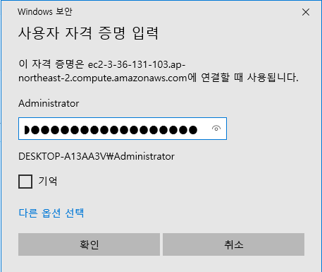 좀 전에 다운로드한 원격 데스트톱 파일을 실행시켜 준 다음 암호를 입력하여 줍니다.