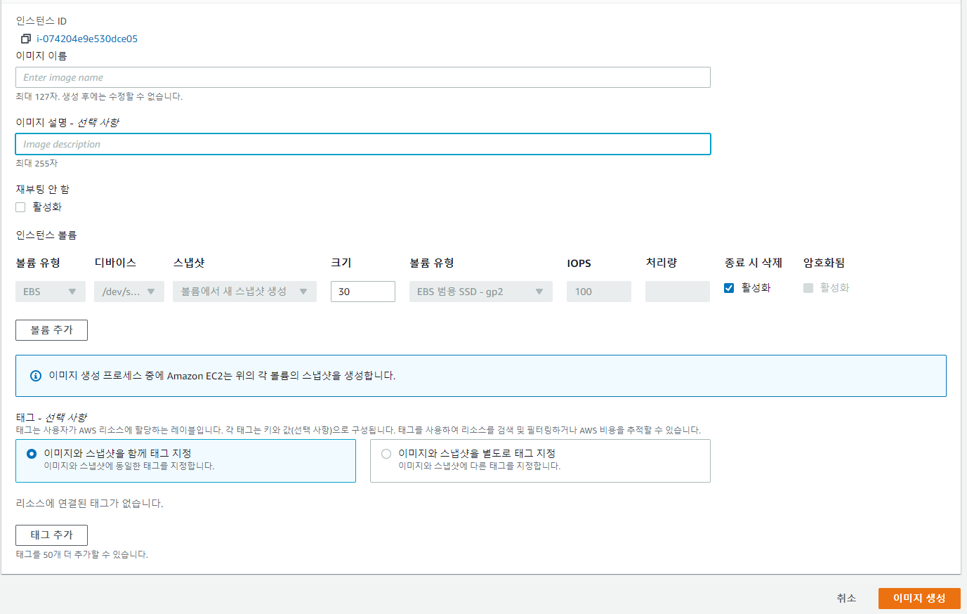 이미지 정보를 입력하는 화면이 호출되면 정보를 작성 한 다음 오른쪽 하단의 이미지 생성 버튼을 눌러 줍시다.