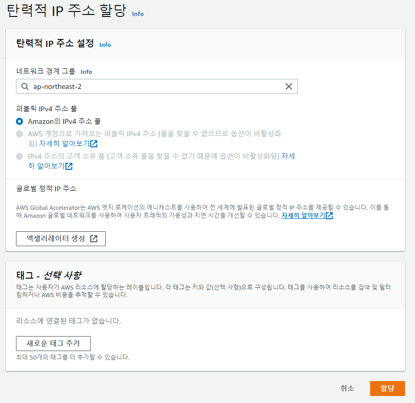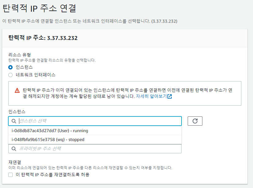 인스턴스를 사용하면서 이처럼 매번 IP주소가 변경되는 것을 방지하기 위해서 Elastic IP 할당받아 사용할 수 있습니다.