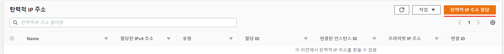 그다음 우측 상단의 탄력적 IP 주소 할당 버튼 클릭