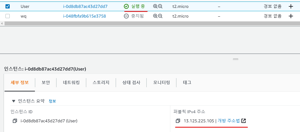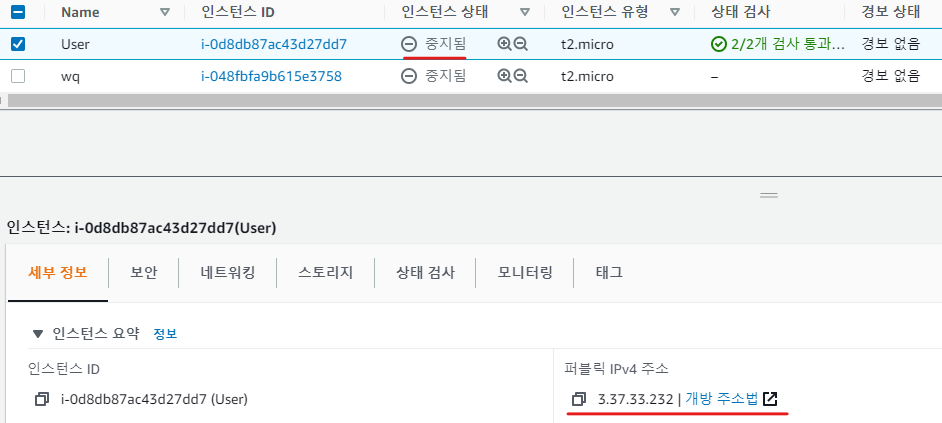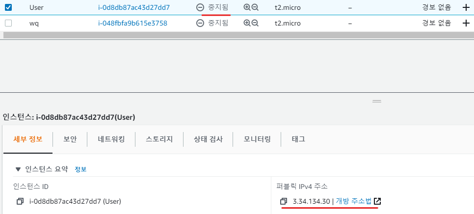 연결이 완료되면 해당 인스턴스에 IP주소를 확인하여 보면 할당받은 Elastic IP 가 적용된 것을 확인할 수 있습니다.