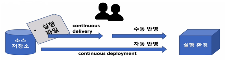 - Continuous Delivery (지속적인 전달) -> 패키지 된 결과물을 실행 환경에 수작업 으로 배포
