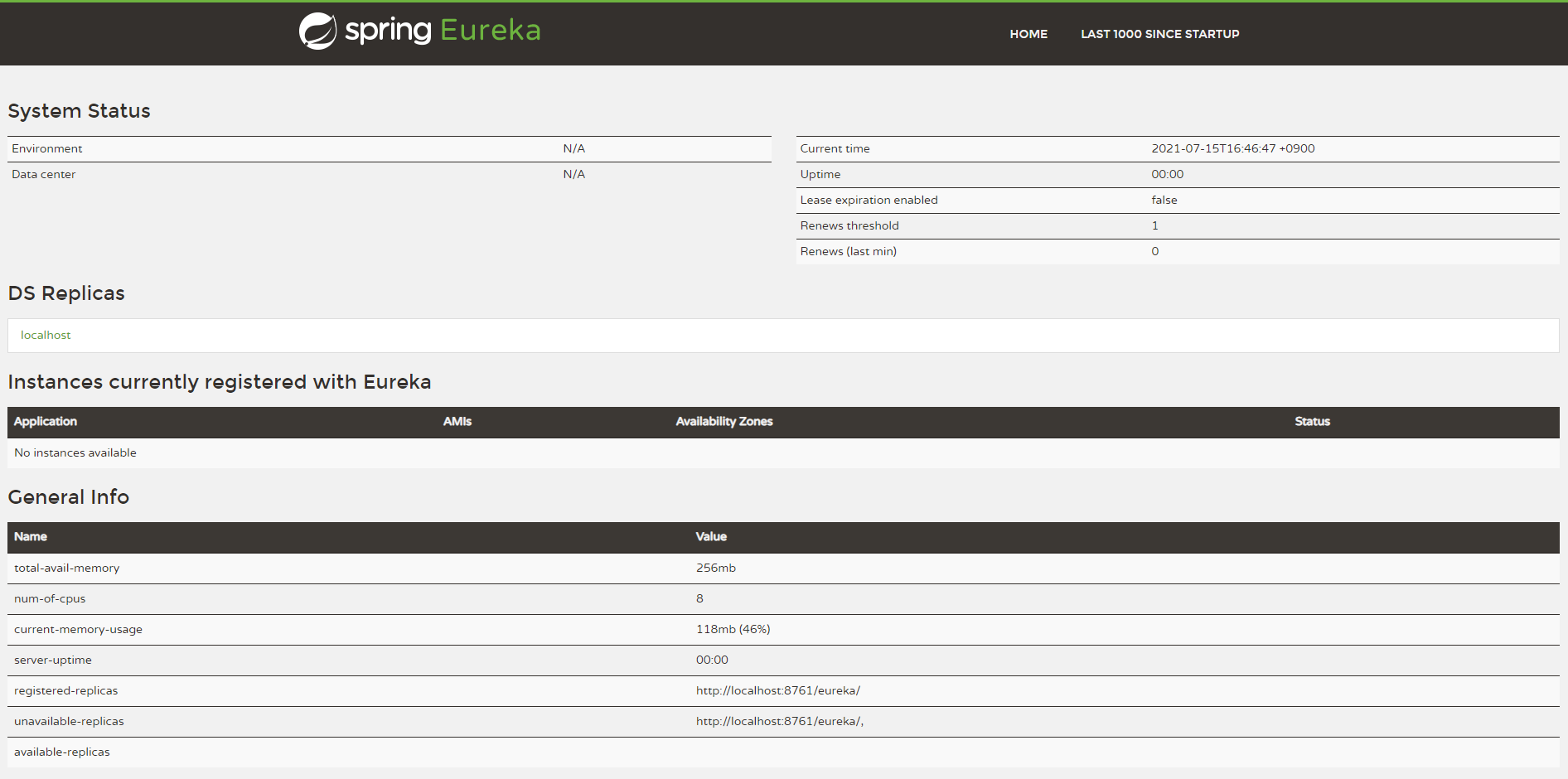 - Eureka Server 실행 후 접속하여 보면 아래화 같은 화면을 확인 할 수 있다.