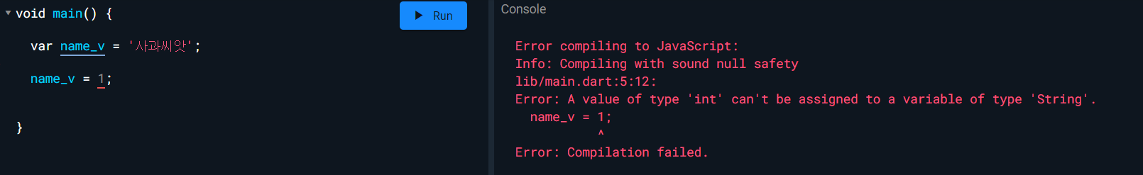 하지만 var의 경우 중간에 타입을 변경할 경우 타입 변경이 안되어 오류가 발생합니다.