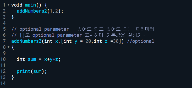optional parameter는 [ ] 안에 선언된 파라미터는 말 그대로 옵션으로 취급하여 있어도 되고 없어도 정상적으로 작동합니다. 또한 아래 이미지처럼 기본값을 설정할 수 있습니다.