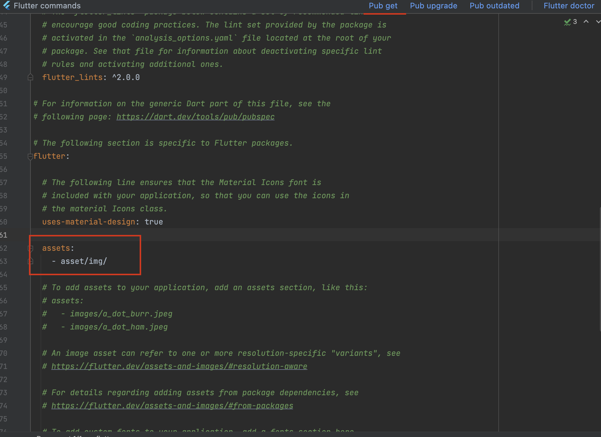 다음으로 이미지를 사용하기 위해서 pubspec.yaml 파일을 열어 아래처럼 코드를 작성한 다음 오른쪽 상단의 Pub get을 클릭하여 줍시다.