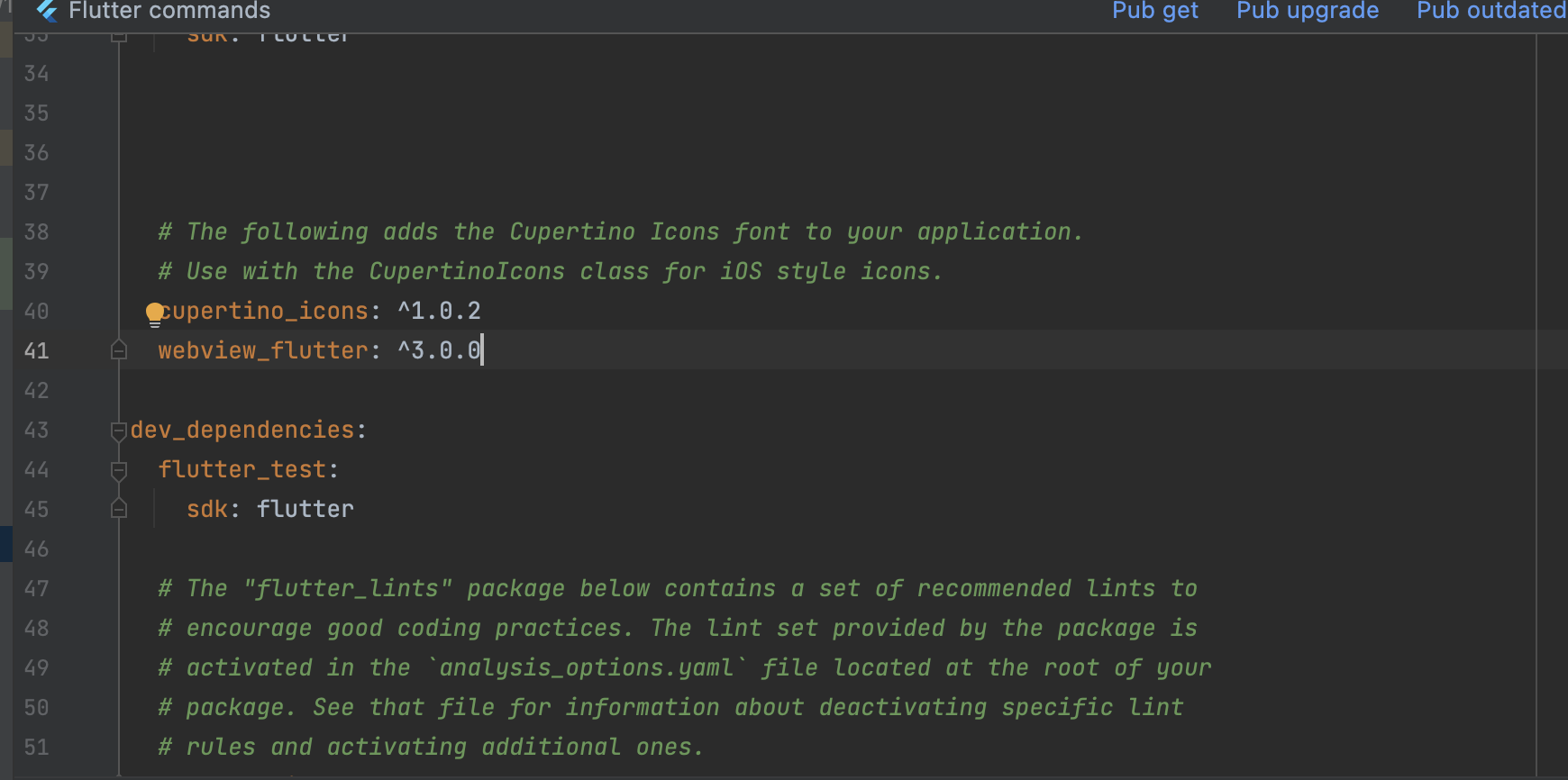 아래 사진처럼 작성 후 pub get!